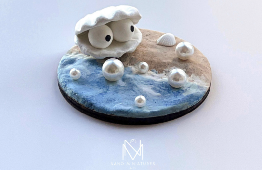 完成品:黏土沙灘,海水做底板、一個Cute版白色貝殼(開殼有一雙小眼睛),旁邊可以加幾粒小珍珠做裝飾。
